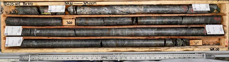 TDG25-001 intersected 100.0 m grading 2.24 grams per tonne (“g/t”) gold (“Au”) and 0.38 % copper (“Cu”) from 308.0 m depth, contained within a broader 240.6 m zone grading 1.23 g/t Au and 0.23 % Cu (Table 1 for drill results summary; Figures 1a-c for Core Images).